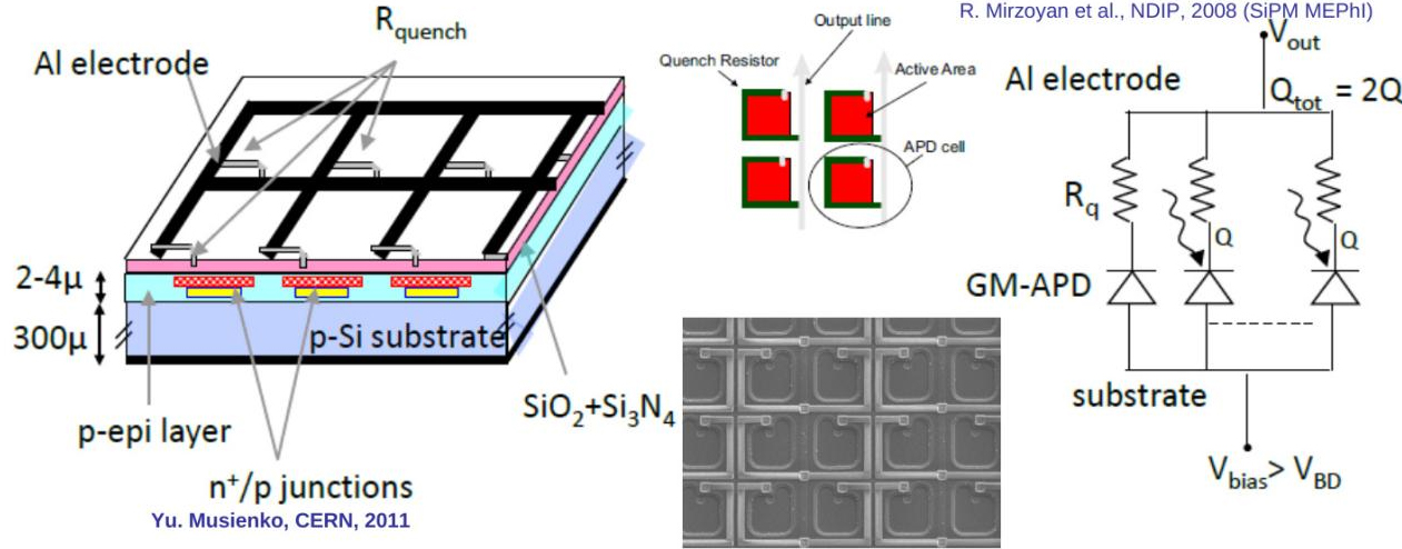 所有并联的SPAD脉冲在输出端相加,输出电荷的幅度与触发的微单元数量成正比,因而SiPM能实现从单光子到数千光子的线性计数。其工作过程如下:
