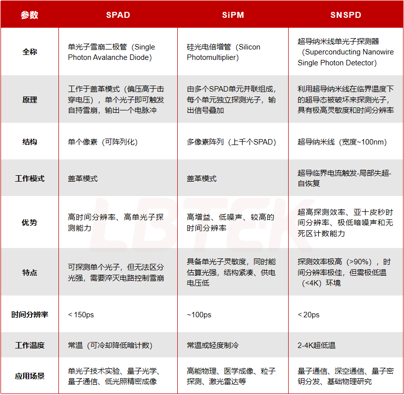 表1 单光子探测器SPAD/SiPM/SNSPD对比