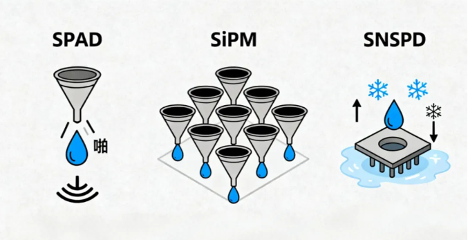 SNSPD是超导材料做的接雨器,必须在极低温下工作,但它能接住最轻最轻的雨滴(单个光子),而且反应极快,适合高端科研或量子通信。