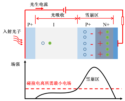 光子触发:当光子被吸收后产生电子‑空穴对,强电场会把它们加速,使其在耗尽区内产生二次载流子(冲击电离),形成雪崩倍增。