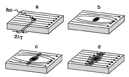2、一个光子被纳米线吸收后,破坏局部库珀对,形成“热点”(正常态区域);