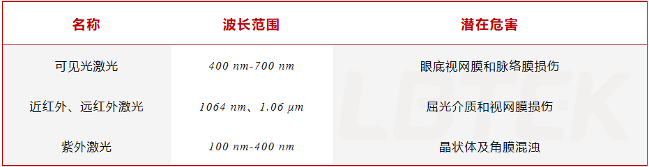 激光造成的主要危害包括激光对眼睛、皮肤以及其他部位的危害。眼睛是激光最易损伤的器官,因为眼球本身就是一个高效的光学系统。激光通过角膜、晶状体等屈光介质后,会在视网膜上高度聚焦,能量密度可提高数万倍,造成严重损伤,由于眼睛对不同波长的激光透过率不同,因此,不同波长的激光对眼睛的伤害部位不同。