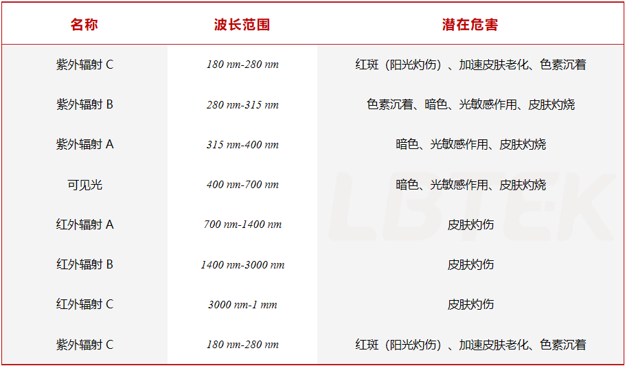紫外激光对皮肤的作用主要是老化,在紫外激光照射皮肤时会引起皮肤红斑、老化,过量时会导致严重的癌变。对皮肤危害性最大的紫外光波在 270 nm~290 nm,波长比270 nm~290 nm 大或小的紫外激光,危害程度都相对地减少。