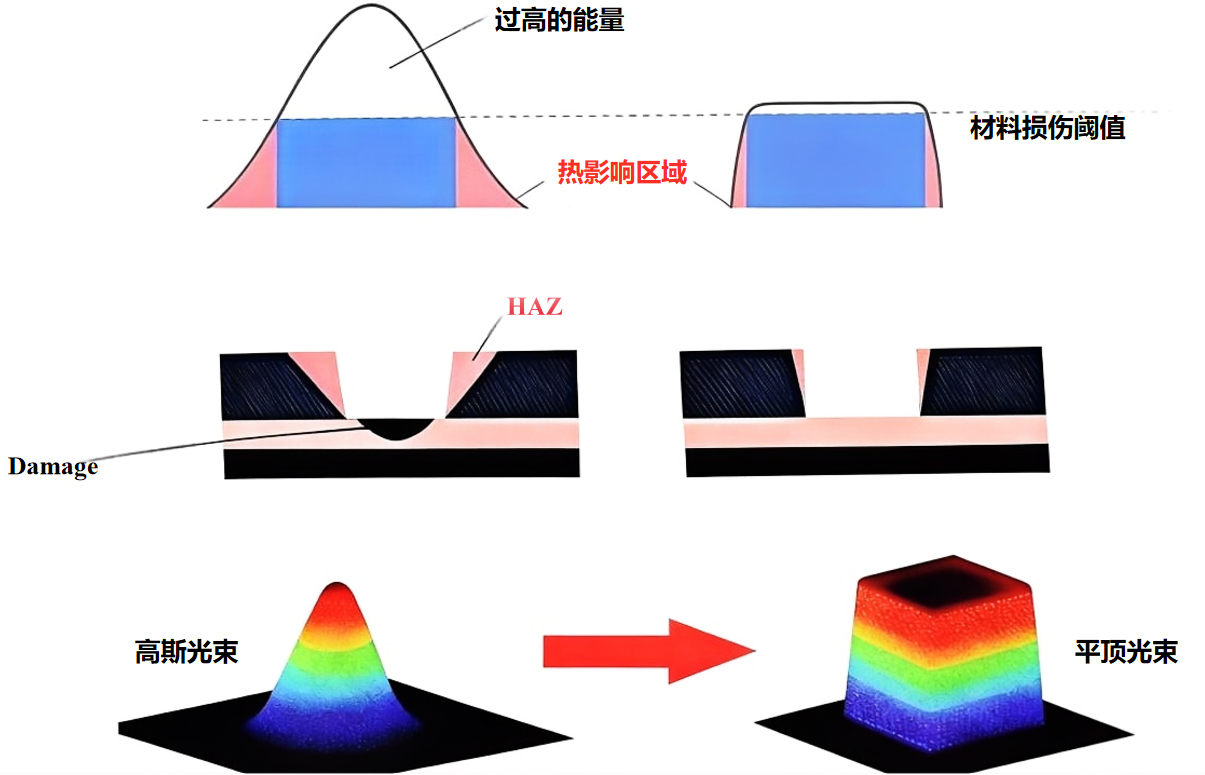 采用光束整形技术,将高斯光斑整形成平顶光斑,一方面减小划线边缘的热损伤,另一方面,更好的保证划线底部的平整性。 |