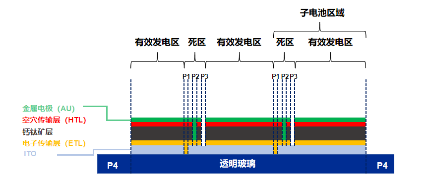 钙钛矿电池在P1外侧到P3外侧存在发电死区,其死区面积和线宽直接相关。降低死区面积,增大有效吸光区域可使发光效率提升。 |