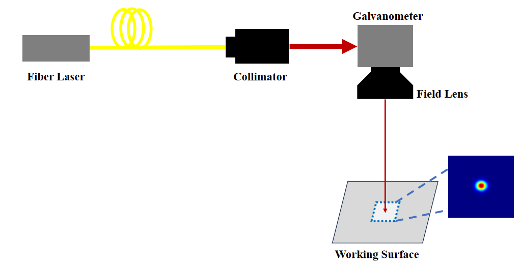 · 扫描振镜及F-Ө 场镜:由计算机进行控制的电机驱动,作用是将激光光斑精确定位在加工面的任一位置。通常使用专用平场 F-Ө 场镜来避免出现扫描振镜单元的畸变,达到聚焦光斑在扫描范围内得到一致的聚焦特性