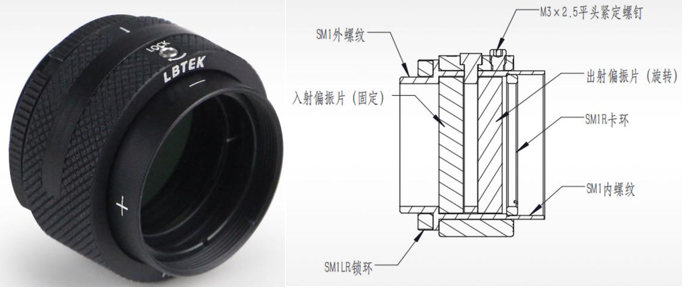 LBTEK的可调偏振分束器可以实现线偏振光束透射强度的连续改变,线偏光先经过旋转安装座中的半波片,再通过偏振分束立方,透射P光,反射S光。