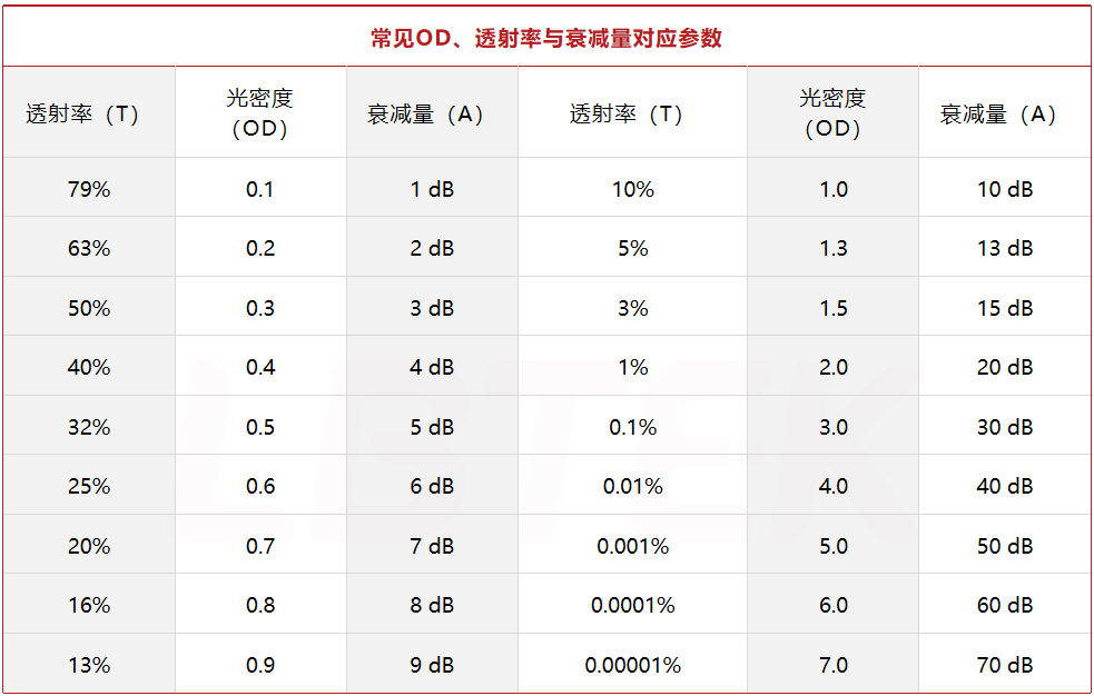 当OD值为1时,透射率T = 10-1=10%,出射光强衰减到入射光的10%;OD 值为2时,透射率T = 10-2=1%,出射光强衰减到入射光的10%。