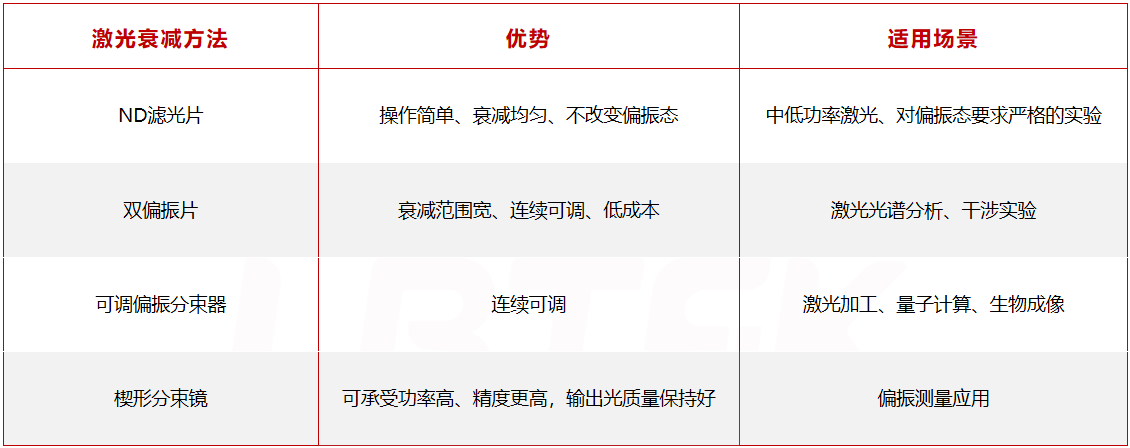 基于以上四种激光衰减方案,我们也为你整理了它们各自的优势和适用场景:
