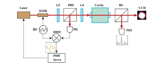 (1) 用在激光频率稳定:例如,利用Pound-Drever-Hall方法的激光稳频,如图4所示。图中激光器输出频率为ω的激光,然后经过EOM,对激光光场进行射频电光相位调制,然后将调制后的激光信号经过二分之一波片、偏振分束棱镜与四分之一波片进入光学腔,与光学腔谐振。