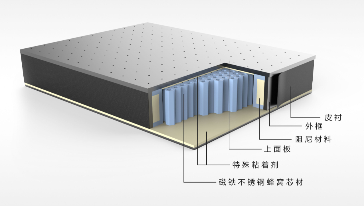 蜂窝台面上面板通常采用430高导磁不锈钢,外框、底板采用A3钢,对于需要无磁台面的需求,也可使用304/316L不锈钢和铝制的蜂窝内芯。六边形蜂窝内芯的设计,可以在最小材料用量下实现最大弯曲刚度的同时减轻台面的重量。