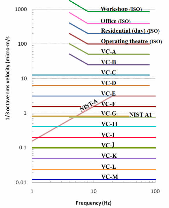 VC曲线的标准震动等级或振动等级包括:Workshop(ISO),Office(ISO),Residential Day(ISO),Op.Theatre(ISO),VC-A,VC-B,VC-C,VC-D,VC-E,VC-F,VC-G, NIST-A,NIST-A1,VC-H,VC-I,VC-J,VC-K,VC-L,VC-M。