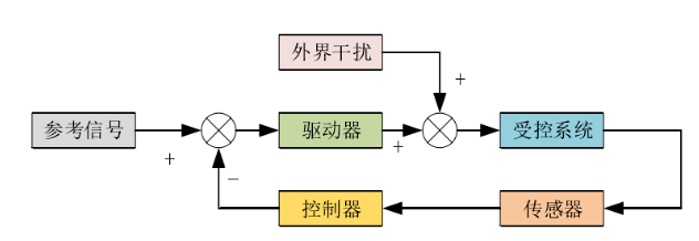 外界振动干扰作用在受控系统中,受控系统产生响应的系统输出,而传感器检测到输出量,将输出量传输到控制器,控制器根据此输出响应和相应的控制策略,运算得到所需的控制信号,并且将控制信号传输到驱动器,驱动器根据控制信号产生相应的电流或者电压信号用以驱动主动执行器,从而调整系统的包括刚度、阻尼在内的关键参数,并且依次不断循环,动态地调整系统的参数,实现主动减振。