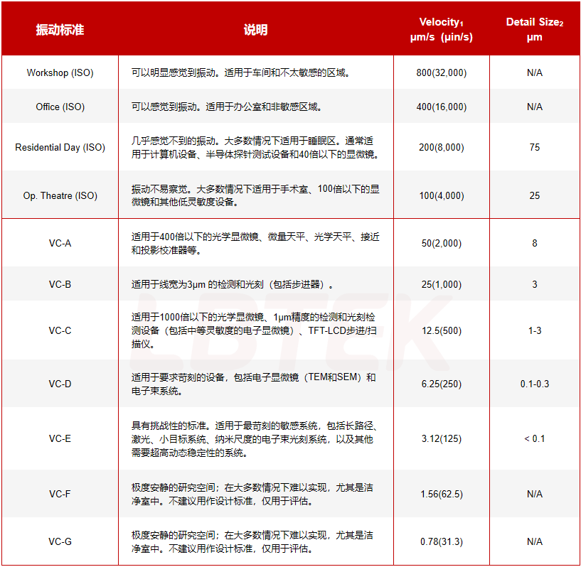 对于光学平台,普通的阻尼隔振平台可达到VC-B的标准,普通的气浮隔振平台可达到VC-C的标准,部分气浮摆杆隔振平台可达到VC-D的标准,而主动隔振平台则可达到VC-E/VC-F的标准。