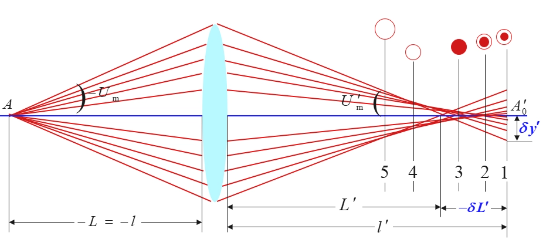 球差是入射高度 h1 或孔径角 U1 的函数,其变化规律可由 h1 或 U1 的偶次幂级数表示。球差具有以下特征: