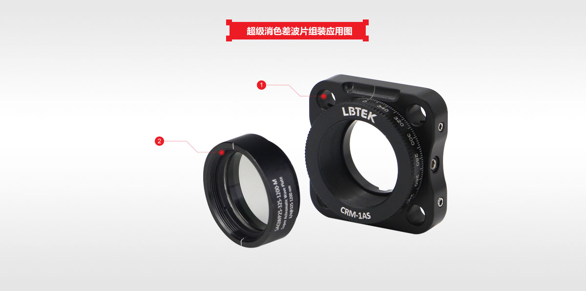 | LBTEK 超级消色差波片组装应用图 | ① 16 mm同轴系统旋转调整架 CRM-05AS×1 | ② Ø12.7 mm超级消色差波片 ×1 |