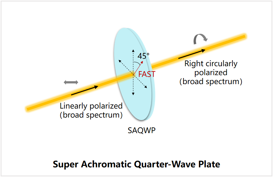 超级消色差四分之一波片(SAQWP)常用于将某一波段内的线偏振光转变为圆偏振光,其作用机理与传统四分之一波片一致:当线偏振光与波片快轴重合入射时,经过SAQWP后出射光仍为线偏振光;当线偏振光与波片快轴成一定角度入射时,经过SAQWP后出射光为椭圆偏振光。特别的是,当波片快轴为45 °时,若入射线偏振光为水平0 °,则出射光为右旋圆偏光;若入射线偏振光为竖直90 °,则出射光为左旋圆偏光。