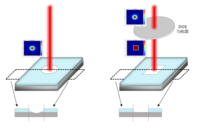 通常情况下,针对紫外激光器,由于液晶对于紫外光吸收太大,因此只能用基于紫外熔融石英材质制成的匀化DOE对紫外光进行匀化。