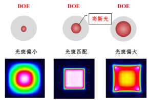 在调节过程中,当入射到DOE的光斑偏小时,会呈现中心亮边缘暗的强度分布;光斑偏大时,呈现中心暗边缘亮的强度分布。以此作为参考,可以更快捷地实现调节目标。