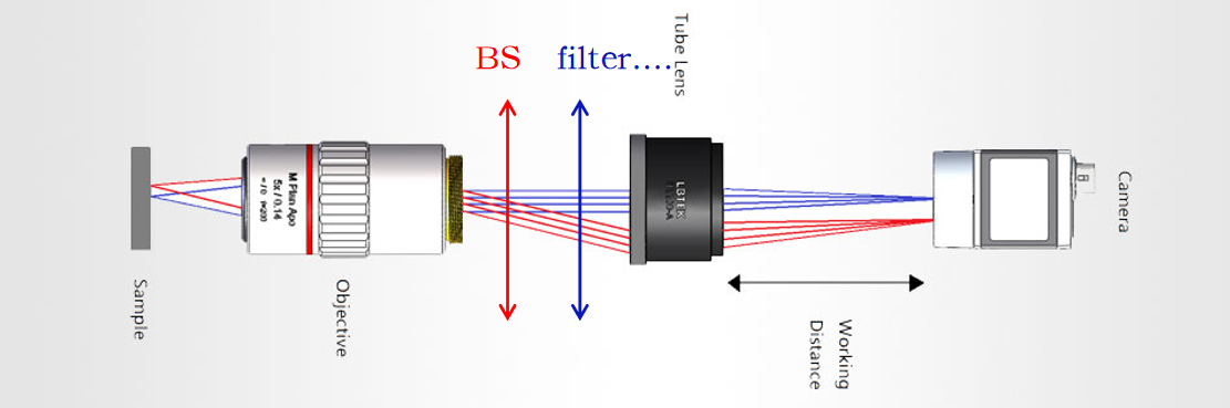 光学成像模块主要由物镜和套筒透镜(Tubelens)构成的无限远成像模块组成。所谓无限远,即假设套筒透镜的口径足够大,物镜和套筒透镜之间的距离被无限拉远,中间插入一系列传输器件,如BS、filter等,不会影响原有的成像,这也是显微成像中,无限远成像模块高适用性的原因之一。