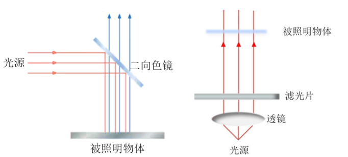 相比于透射式照明,落射式从样品上方照射,光路中配有分光镜,因此能适用于透明及不透明的检测对象,由于物镜同时具备聚光功能,它不受数值空间限制,操作更为便捷,从低倍到高倍观察时,这种方式可确保整个视野获得均匀照明,克服了透射照明区过大,导致荧光标本的荧光迅速衰减,进而对厚载玻片或不透明样本效果不佳的问题。