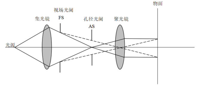 在柯勒照明结构中,点光源经聚光镜前组成像在照明系统的视场光阑上;聚光镜前组(柯勒镜)经过聚光镜后组成像于标本处,同时也把照明系统视场光阑成像在无限远处,使之与远心物镜的入射光瞳重合。