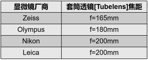 一个显微成像系统,其放大倍率是由物镜、套筒透镜和观察目镜共同决定的。常规套筒透镜为消色差透镜,可以优化成像过程中的边缘彩带现象。为了记录和提取实验数据,观察目镜一般用高分辨率的CMOS或CCD代替。因此,需要考量的是物镜和套筒透镜之间的关系,需要根据物镜的放大倍率、套筒透镜的焦距以及不同显微镜厂商采用的套筒透镜焦距来进行计算。