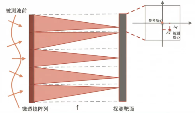 在波前传感器的发展历程中,夏克-哈特曼(Shack-Hartmann)技术凭借其实时性强、结构紧凑、易于集成等优势,已成为目前科研与工业领域应用最广泛的波前传感手段。Shack-Hartmann波前传感器使用微透镜阵列将光束分成离散的强度点阵,从而识别光穿过各个光学器件或光学组件引起的畸变。其工作原理如图1所示:
