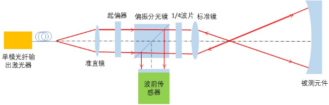 利用波前传感器测量光学元件面形光路示意图(如图3所示),激光器单模光纤输出,经准直器输出准直光束,通过起偏器,然后经过偏振分光棱镜,透射的P光经 1/4 波片为圆偏振光,通过标准镜聚焦至被测凹面镜的球心处,然后通过凹面镜反射,再通过标准镜准直为平行光,经 1/4 波片变为S光,通过偏振分光棱镜反射至波前传感器。波前传感器相比传统干涉仪对光源的相干性没有要求,且动态范围大,不受外界环境影响,可实现动态测量。
