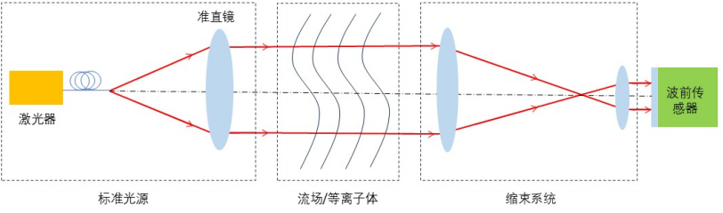 利用波前传感器测量流场折射率分布或等离子体密度分布光路示意图(如图4所示)。激光器单模光纤输出,经准直器准直为平行光。平行光经过被测流场/等离子体,然后再经过缩束系统,将光束缩束至合适的光斑大小,最后激光打入波前传感器中。波前传感器实时测量光束波前相位,根据流场的折射率/等离子体密度和光场相位畸变之间的理论模型,即可得到被测流场折射率分布/等离子体密度分布。