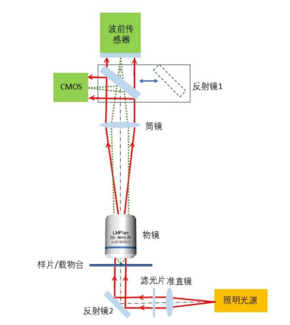 基于波前传感器和光学显微成像系统可实现生物活体细胞等透明物体的光学显微相位成像(图5)和光滑表面三维形貌测量(图6)。照明光源可采用单模光纤输出激光器、光纤输出LED光源,携带样品信息的光源经过物镜和筒镜后入射到波前传感器上。其中,被测样品表面与波前传感器探测面需满足物像共轭,反射镜1为可选器件,加入反射镜1 ,调节载物台高低利用CMOS获取被测物体清晰像,从而辅助测量。