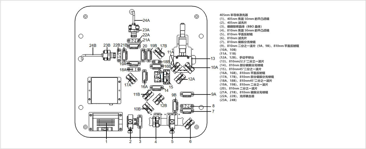 本系统通过非线性晶体的自发参量下转换过程,将入射的部分光子转化为双光子态。然后通过波片、部分偏振分光棱镜及其他线性光学元件的组合,从而实现四种D-J算法门线路。通过旋转波片角度,再与偏振分光棱镜结合,得到在不同基矢下投影测量结果,最终获得输出态。本系统可完成单比特量子逻辑门实验、两比特量子逻辑门实验、 Deutsch-Jozsa 算法演示。