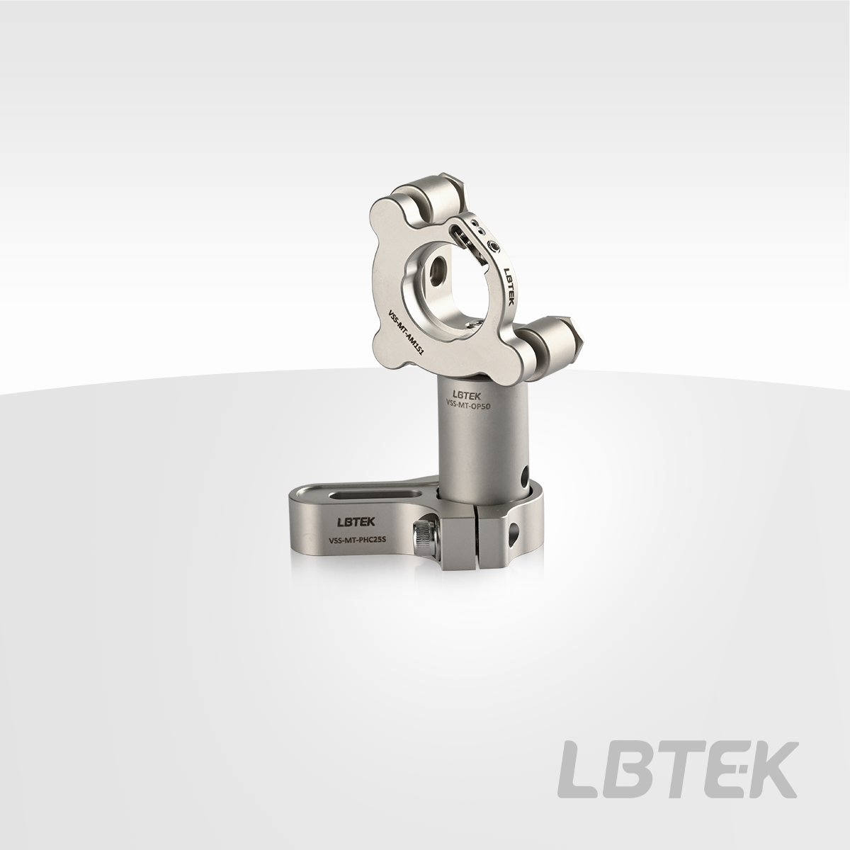 LBTEK 1英寸不锈钢镜架,用于安装直径25.4 mm的光学元件,带3个无旋钮的M6×0.25精密调节器。两种光学元件低变形固定方式可选,VSS-MT-AM1S4为挠性弹片和固定螺丝固定光学元件,光学元件最小厚度为2 mm;VSS-MT-AM1T2为卡环直接固定光学元件,购买镜架直接附送2个不锈钢卡环,且卡环固定式光学元件最厚不超过8 mm。3个无旋钮的M6×0.25精密调节器,通过六角扳手可调节光学元件俯仰、偏摆。光学调整架侧面有M4沉头安装孔,购买LBTEK不锈钢镜架附送真空内六角超薄头螺丝(带通气孔)以及内六角扳手。