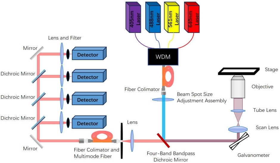 LBTEK提供的VSPI激光扫描共聚焦显微镜使用405 nm、488 nm、561 nm、640 nm主流激光波段,可适配多种荧光标记需求。共聚焦模块横向分辨率可达150 nm、纵向分辨率可达300 nm。视场范围120 um*120 um,兼顾成像精度与观察范围,其高清、高效、灵活的成像功能与全面、精准、智能的图像处理能力使其广泛应用于细胞生物学、神经生物学以及其他领域。