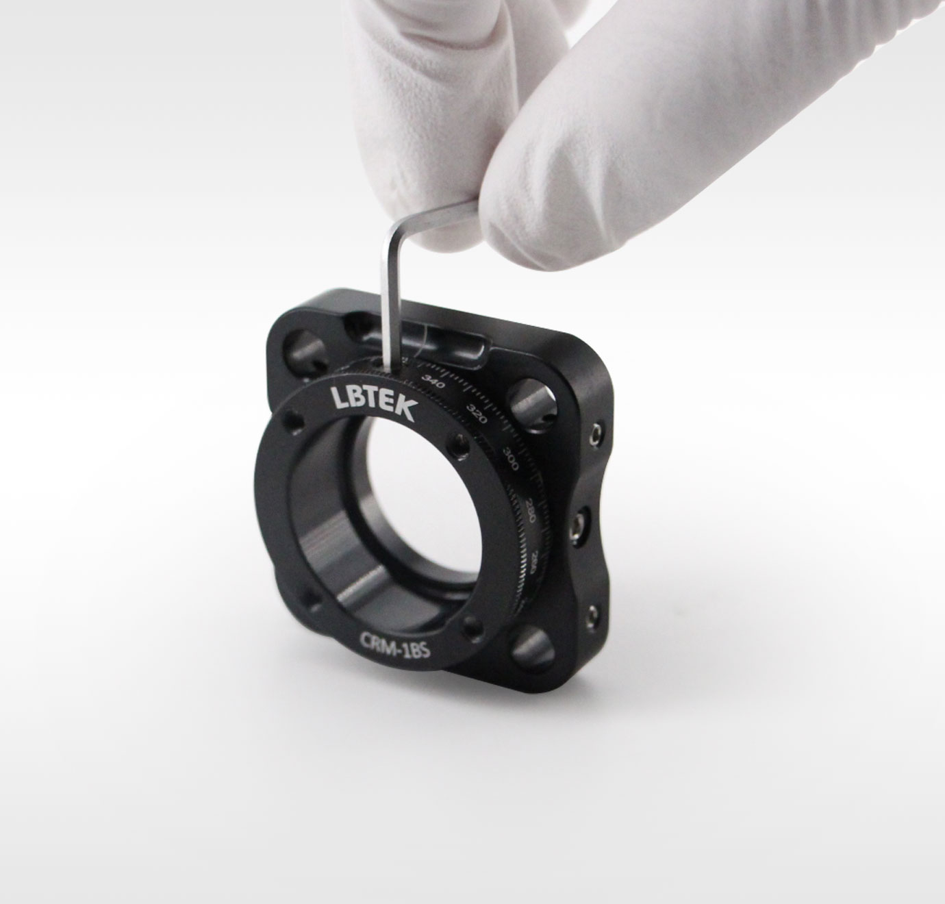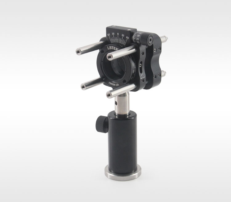 LBTEK CPRM-1A调整架适用于安装Ø25.4 mm,最厚9.4 mm的光学元件,通过单个SM1R卡环固定光学元件。可360°旋转,每20°有刻线,且差分刻度提供5'(0.08°)分辨率,侧面带粗调紧定螺丝,当粗调锁定时,可使用测微头在±7°位置内微调旋转架位置,测微头每旋转一圈对应旋转架转1°,精度为1.2'(0.02°)。CPRM-1A底部带M4螺纹孔用于连接光学接杆。