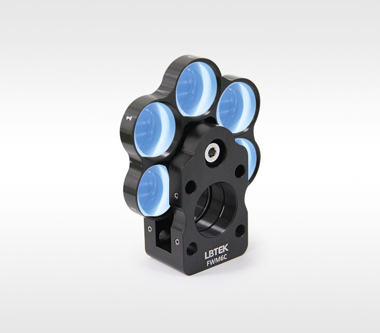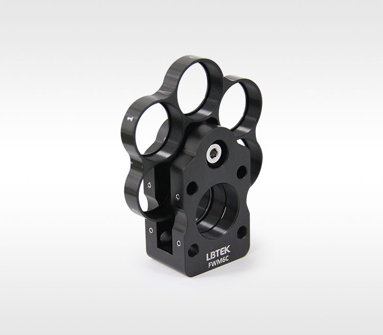 LBTEK 30 mm滤光片转轮有六个安装槽,安装槽内壁为SM1螺纹,用于安装直径25.4 mm的光学元件,附带6个SM1R卡环。转轮可绕转动轴自由转动,并通过斜槽与底座钢球进行精确的六点定位,可将六个滤光片中心分别对准同轴系统。转轮固定底座的输入和输出端口也具有SM1内螺纹,可兼容SM1透镜套筒。同轴杆通孔侧面带有M3固定螺丝,通过1.5mm六角扳手可以固定。固定底部包含一个M6和两个M4的安装孔,可与标准光机械元件兼容。LBTEK 30 mm滤光片转轮固定底座下部的两个Ø6 mm同轴安装孔完全贯穿,而底座上部两处Ø6 mm同轴安装孔为盲孔,可防止同轴杆误撞滤光片。