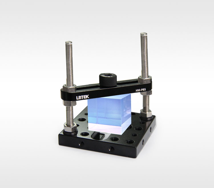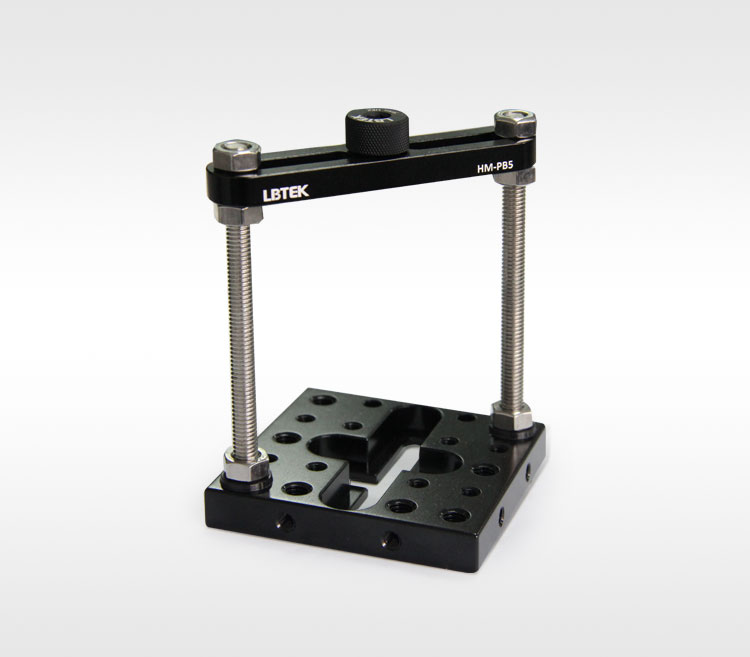 LBTEK V型夹持器,常用于夹持圆柱体的光学或机械元件。V型夹持器HM-V25,通过调节CA-1小型压臂的高度和胶头螺钉伸出长度,可夹持直径3 mm~25 mm的圆柱体;V型夹持器HM-V50,通过调节CA-2大型压臂的高度和胶头螺钉伸出长度,可夹持直径10 mm~50 mm的圆柱体,还可同时安装两套压臂,以提高夹持的稳定性;V型夹持器HM-V76,通过调节配带压臂的高度和胶头螺钉伸出长度,可夹持直径12.5 mm~76.5 mm的圆柱体。同时,HM-V25和HM-V50的V型夹持器的压臂可左右换位,V型块后侧、左右两侧和底部有M4或M6螺纹孔,可安装在标准的光机械元件上;HM-V76可通过底部和侧边的M6沉头孔安装在标准的光机械元件上。 LBTEK 平板夹持器HM-PB5,常用于夹持长方体的光学或机械元件。可通过调节六角螺母改变压板高度进行夹持,夹持长度范围不限,宽度范围0~58 mm,高度范围0~65 mm。压板的U型槽设计可使螺杆根据底部M6螺纹孔位任意调整间距,压板中心带弹簧式滚花内六角手拧锁紧螺钉,可保证夹持物表面不受损伤。底板上有M6腰型槽、M4或M6螺纹孔,可安装在面包板或基座等标准光机械件上。