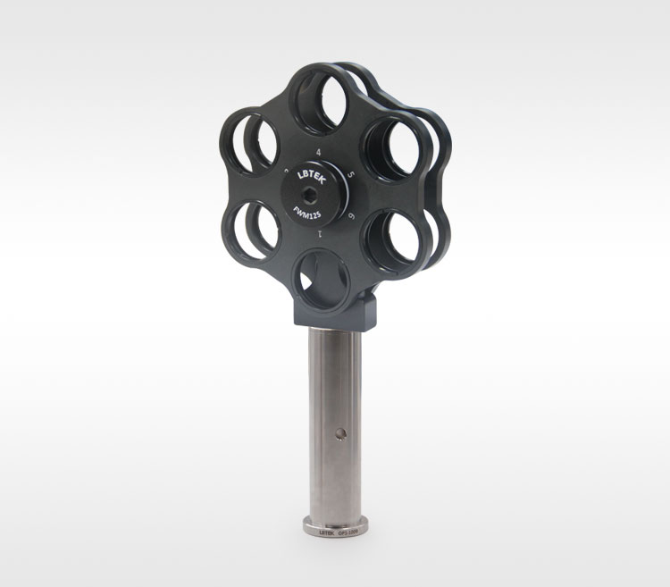 LBTEK 自由空间滤光片转轮,用于安装直径25.4 mm的光学元件,附带12个SM1R卡环。转轮单次旋转的最小角度为30°,可360°旋转。滤光片转轮的底部有2个M4螺纹安装孔和1个M6螺纹安装孔,可直接用LBTEK不锈钢光学接杆支撑,也可以配合LBTEK安装底座(如PB-X系列)直接固定在面包板或光学实验平台上使用。