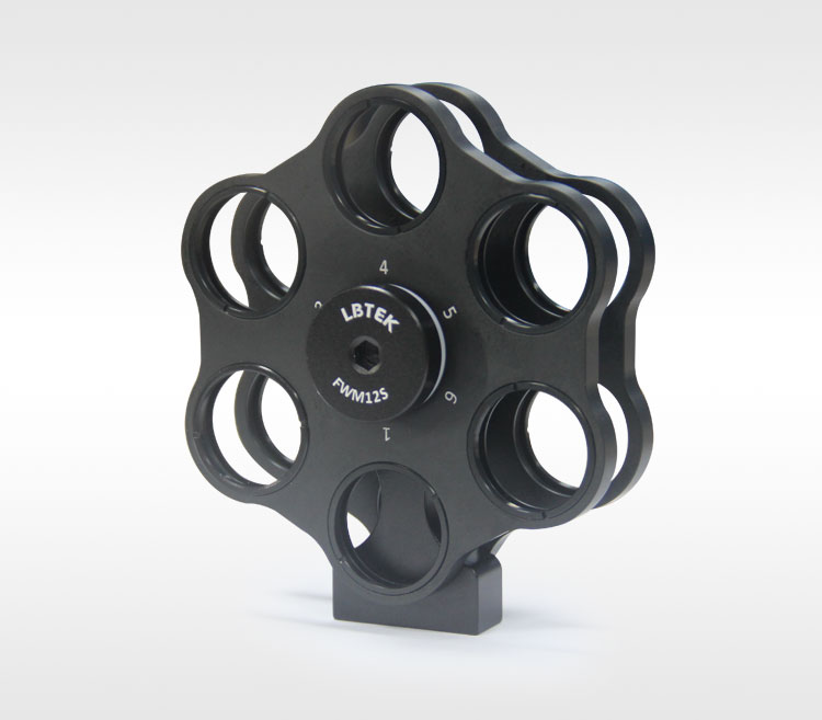 LBTEK 自由空间滤光片转轮为双转轮结构,每个转轮有6个安装槽,共12个安装槽。安装槽内壁为SM1螺纹,用于安装直径25.4 mm的光学元件,附带12个SM1R卡环。每个转轮都可绕转动轴自由转动,并通过斜槽与底座钢球进行精确的12点定位,两个转轮盘通过定位槽可准确定位,可将12个滤光片中心分别对准,调整简单,使用方便。底座底部包含一个M6和两个M4的螺纹安装孔,可与标准光机械元件兼容。