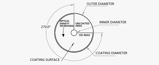 LBTEK连续型中性密度滤光片采用紫外熔融石英基底和完整270°金属(铬镍铁合金)镀膜组成,设计用于240-1200 nm的透射波长范围。连续型中性密度滤光片的中心孔直径均为7.5 mm,便于机械件的安装,可通过旋转来调整连续型中性密度滤光片的OD值。尽管属于反射型中性密度滤光片,但铬镍铁合金膜仍会吸收部分入射光。为保证得到最佳的性能,建议入射光从镀铬镍铁合金膜的一侧入射。同时这种无保护层的金属膜要注意防止接触,接触则可能刮坏无保护表面,清洁时建议使用气吹。