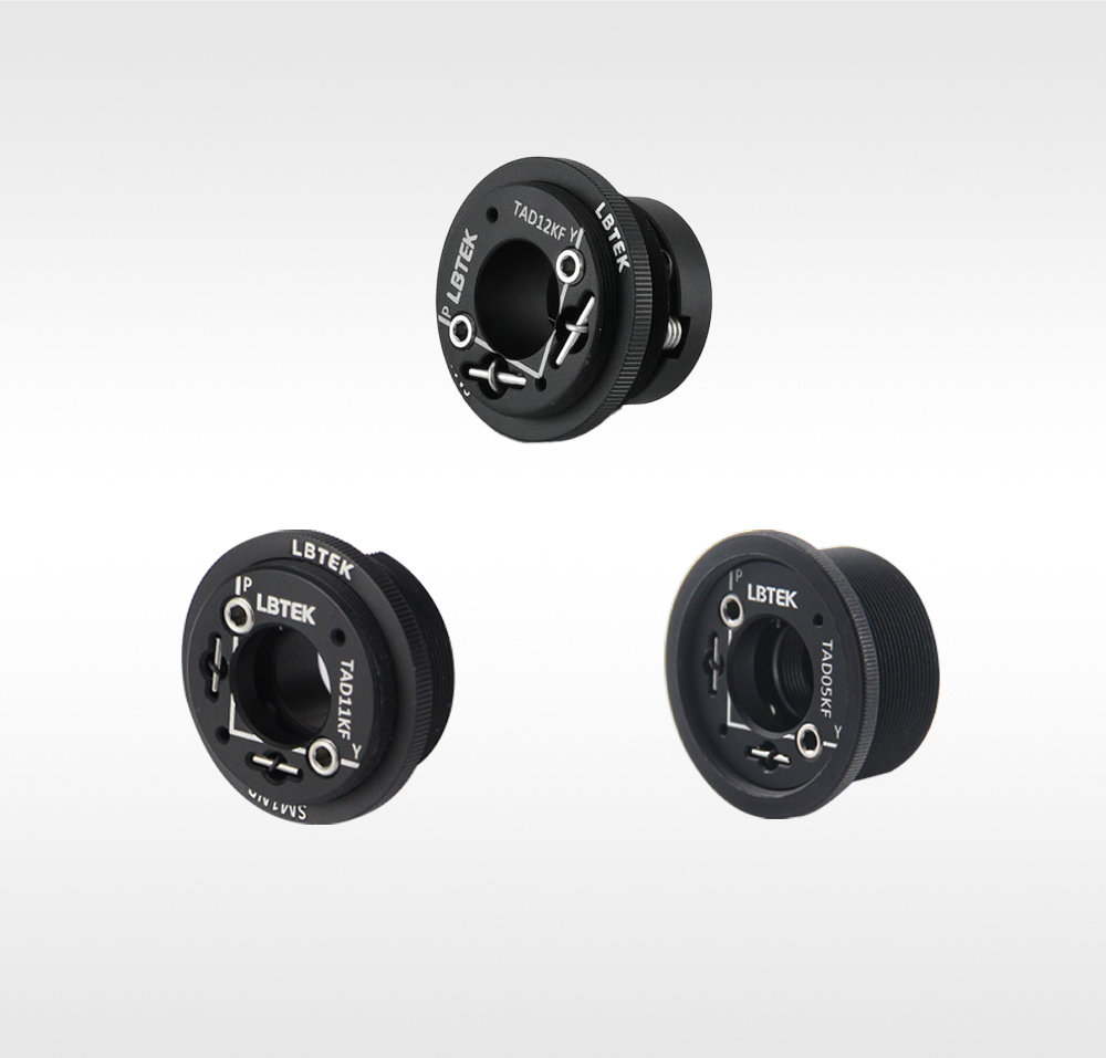 LBTEK 可调转接件TAD05KF可安装固定Ø12.7 mm的光学元件或带SM05螺纹的元件,TAD11KF可安装固定Ø11 mm的圆柱状元件,TAD12KF可安装固定Ø12 mm的圆柱状元件,常用来固定光纤准直器。前两种可调准直器均提供±4°俯仰/偏摆调节,TAD12KF提供±5°俯仰/偏摆调节,转接件的SM1外螺纹适合与Ø25.4 mm透镜套筒或30 mm同轴系统配合使用,转接件附带一个SM1NR锁定环。转接件前板上的两个M4×0.25精调螺丝用于控制俯仰和偏摆,可通过附送的2.0 mm六角扳手进行调节。前板上刻有俯仰和偏转轴标识,且带有两个用于可调扳手OWR-U的孔。 注意:调节M4精调螺丝时,建议在可调±4°范围内使用。为防止精调螺丝拧入过深导致与外安装环脱离引起产品失效,调节时请保证外安装环安装面与精调螺丝表面的深度≤2 mm。