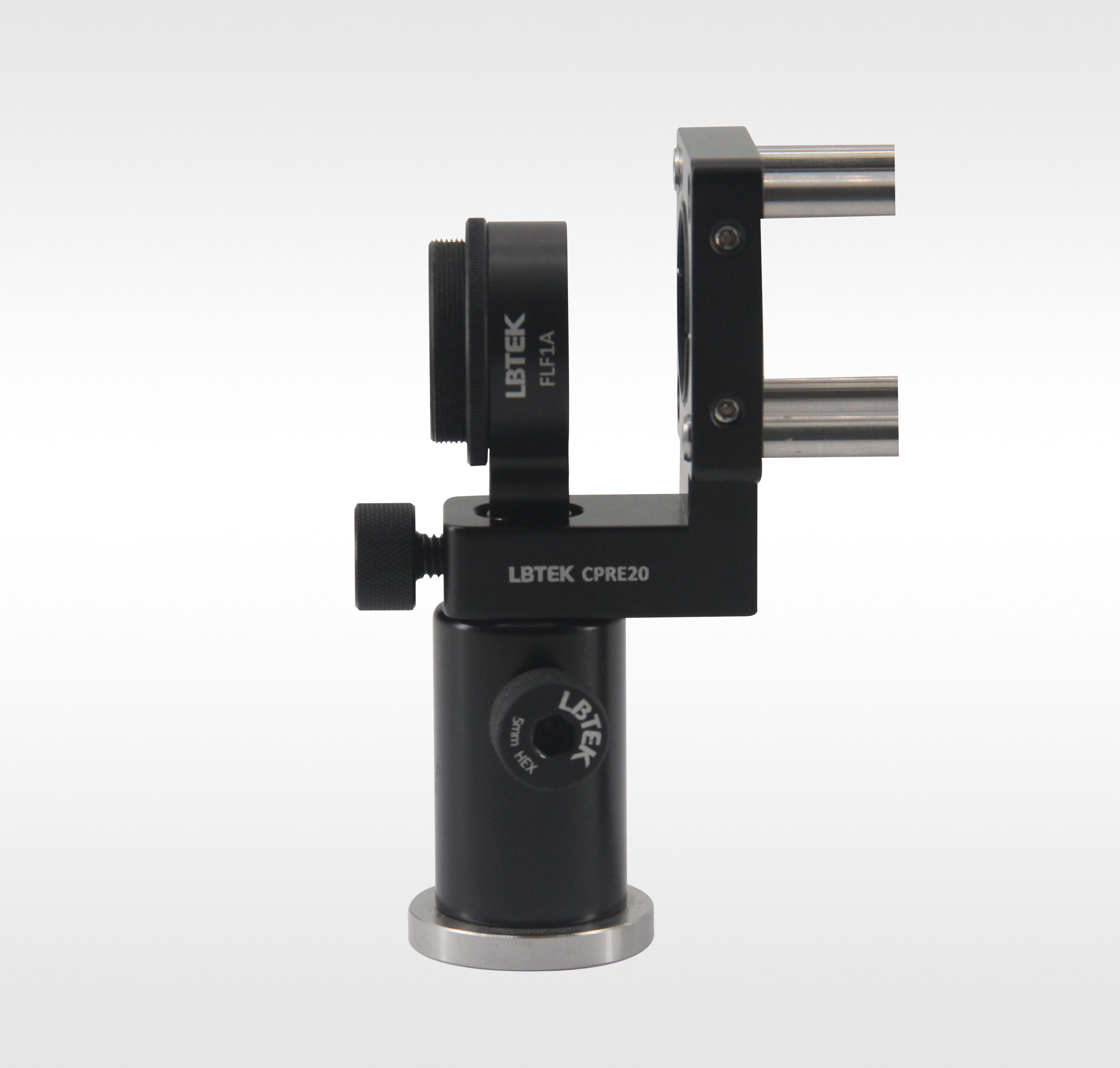 LBTEK提供的 同轴-接杆转接件,可夹持标准Ø12.7 mm接杆,转接件底部内壁上的凹槽与接杆形成双线接触,侧面带M6弹簧式滚花内六角手拧锁紧螺丝,可用5 mm内六角扳手加固夹持(注意:过大扭力会导致锁紧螺丝断裂,建议用L形六角扳手,握住短柄端轻轻紧固),同时可接入30 mm同轴系统中,且能安装Ø25.4 mm光学元件。在高度调节方面,支架底座带有一个通孔,接杆可以完全贯通到底部,以调节元器件高度。