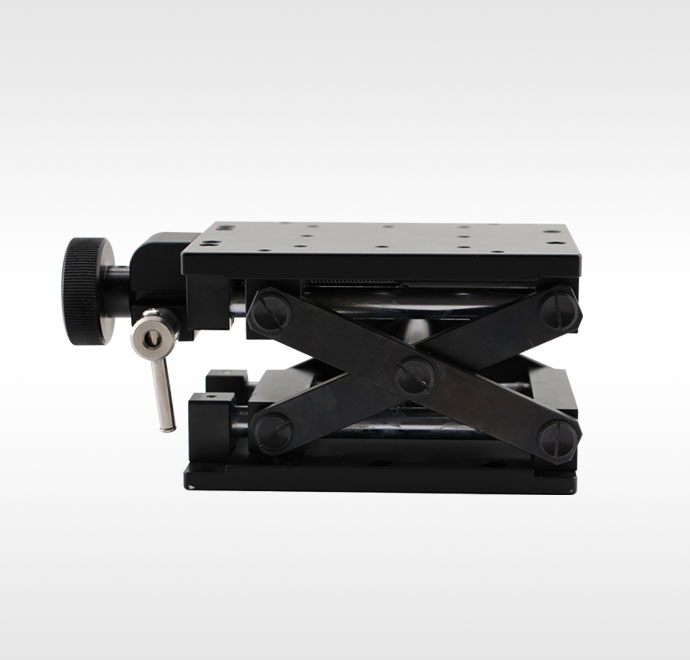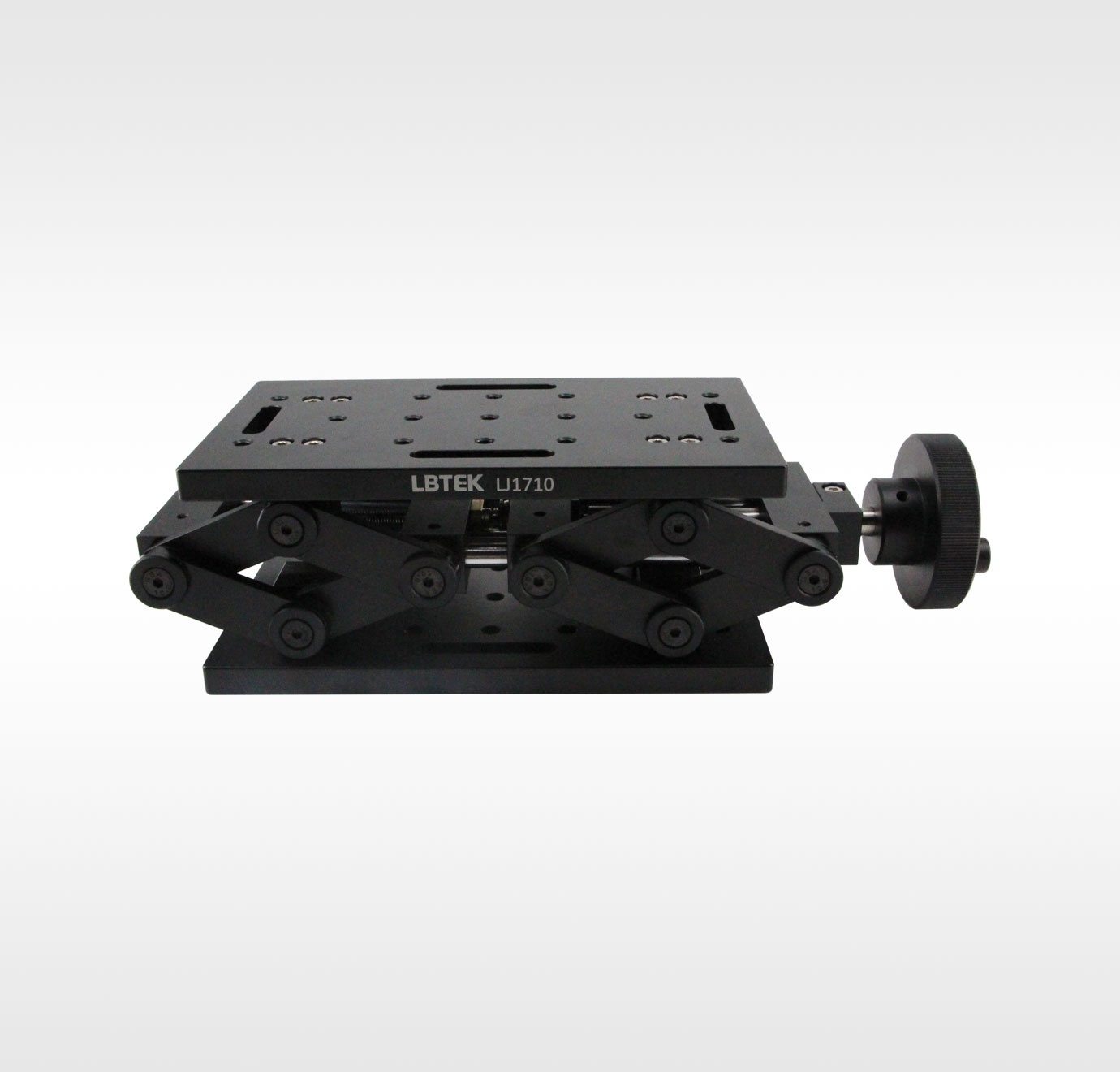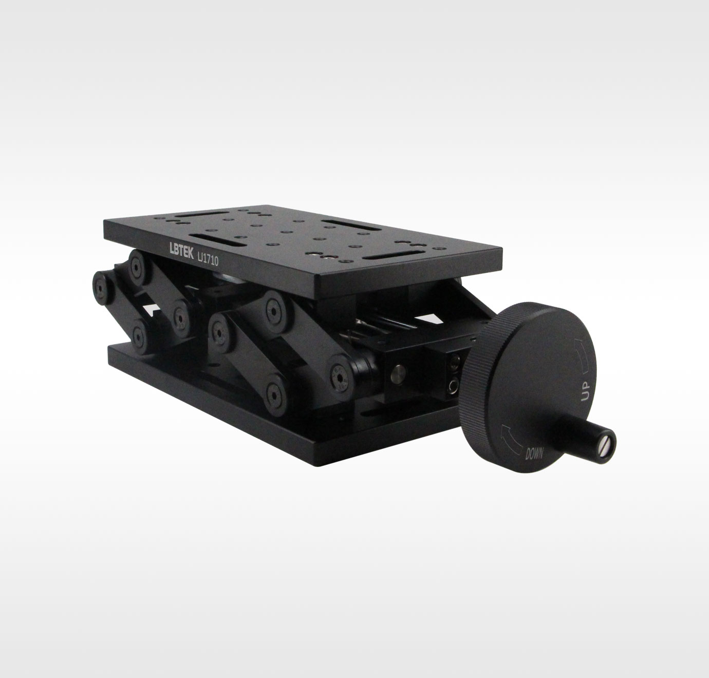 LBTEK 剪式升降台可提供稳定的高度调节,承载能力高,平行度好,非常适用于安装需要调节高度的光机械组件。升降台采用剪式支撑结构,精磨丝杆驱动,双导轨五轴过定位设计或16臂双弓型设计,保证升降台运行的稳定性。升降台通过大滚花手轮调节升降,调节手轮带锁紧机构,调至所需高度后可锁定,保证升降台的长期稳定性。底座和台面都有标准孔距的M6安装孔阵列,以满足常用安装要求。