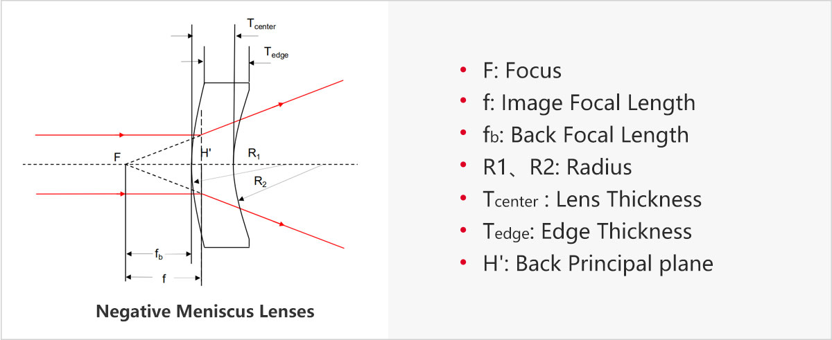 LBTEK 负弯月透镜主要是用于最小化球差。与另外一款透镜结合使用时,正弯月透镜可以增加焦距,在不引入明显球面像差的情况的同时减小系统数值孔径(NA)。当用于会聚平行光时,为了使球差最小化透镜的凸面应朝向光源发射的方向。