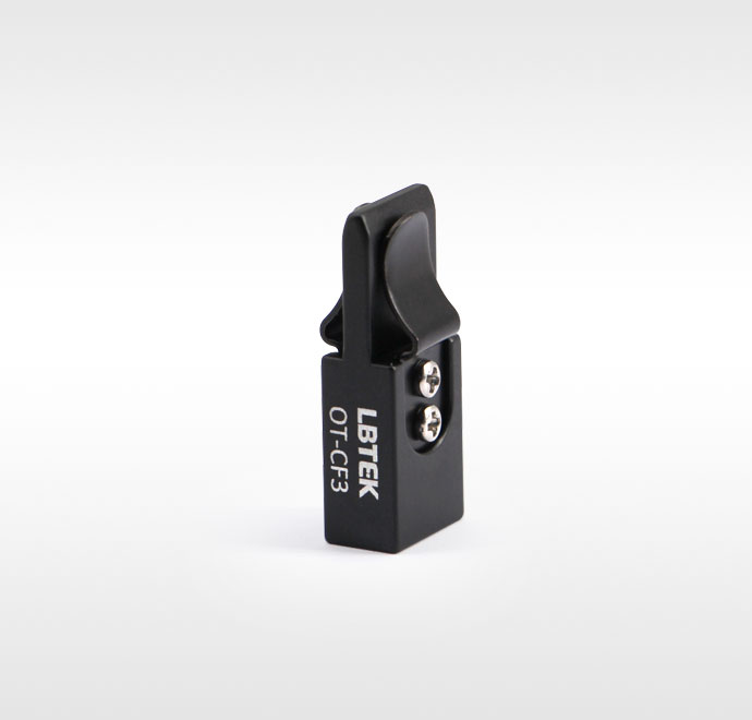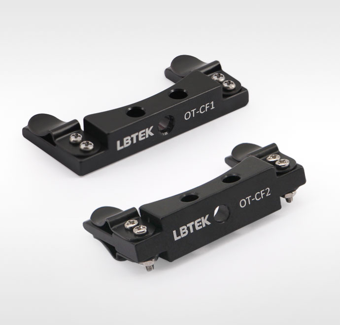 LBTEK滤光片固定架OT-CF1和OT-CF2分别适合夹住一个或两个平板光学元件。夹片部分有尼龙涂层,可防止夹持的光学元件受损。 OT-CF1可以夹持最厚2 mm的平板光学元件,OT-CF2可单侧装载最厚2 mm的平板光学元件或双侧装载最厚1.5 mm的平板光学元件。固定架兼容多种平板光学元件,包括滤光片、近红外检测卡等。固定架底部中心有一个M4的沉头孔,可通过附带的M4内六角圆柱头螺丝安装到接杆或光学平台上。此外,固定架侧面带有两个M4通孔,配合M4螺丝使用,能够叠装多个固定架。