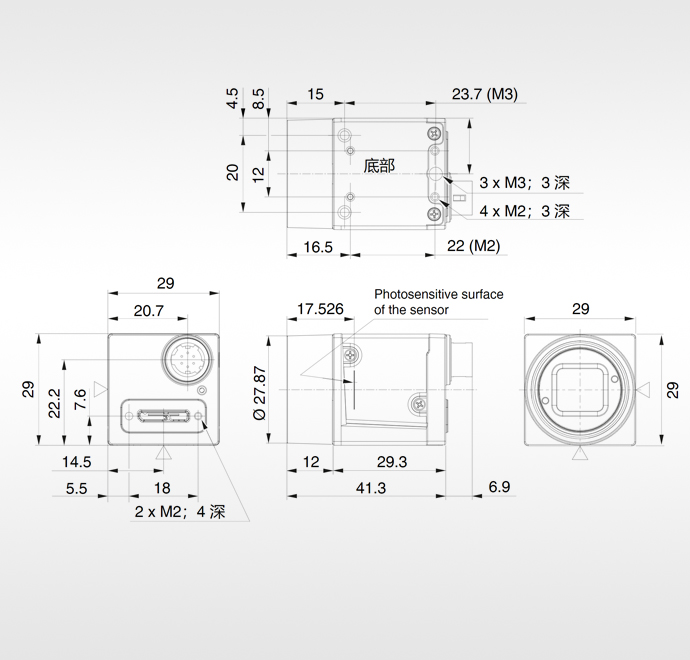 • C-Mount光学接口,底部附带3个M3与4个M2螺纹孔