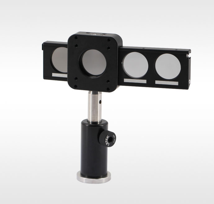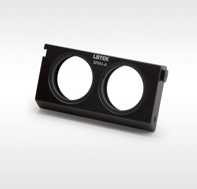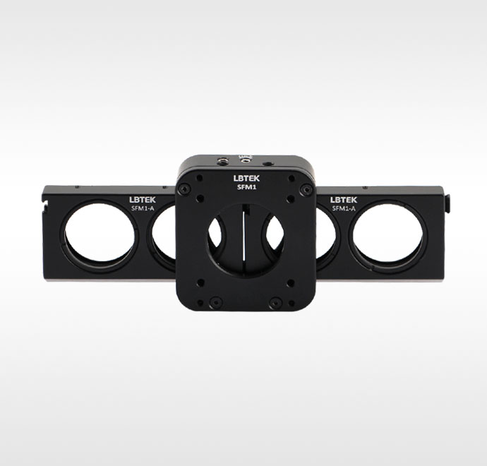 LBTEK 提供的滑动滤光片调整架SFM1附带两个SFM1-A插条,最多可安装四个Ø25.4 mm的光学元件,SFM1-A插条可单独购买。插条与主体通过钢球和V型槽加燕尾轨道进行定位,顶部带有锁紧螺钉可在定位后将其锁紧。底部带有M4螺纹孔用于连接光学接杆。主体带有8个M3螺纹孔用于兼容30 mm同轴系统。盖板上有4个M2.5螺纹孔用于叠加安装架。