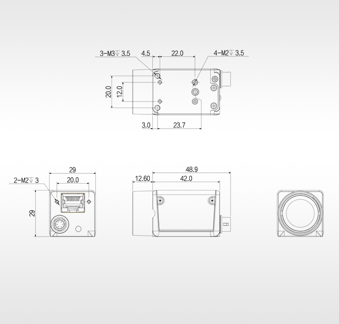 LBTEK 提供的INOVANCE CMOS相机采用GigE数据传输接口,分辨率涵盖30W~630 W可选,外形小巧,软件操作简便,支持软件触发和硬件触发等多种运行模式。其机械外壳输入接口为C-Mount光学接口,便于集成至30 mm同轴系统中,底部带有4×M2及3×M3螺纹孔,可通过接杆支架安装于自由空间。GPIO接口为1路光耦隔离输入,1路光耦隔离输出,1路不带光耦隔离可配置输入输出。附送电源及数据线。