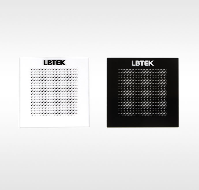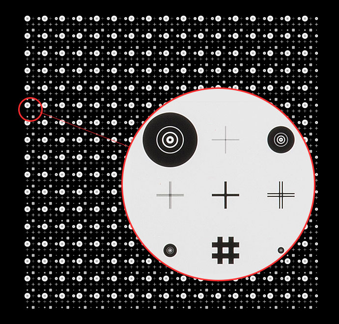 LBTEK 的同心圆和十字线网格靶是以17行和17列组成的289个独立网格,289个网格均匀分布于中间50.8×50.8 mm的位置。每个网格由不同尺寸的四个同心圆图案和五个十字线图案组成,每个同心圆图样具有七种不同半径,每个十字线图样具有一个或两个十字。LBTEK 同心圆和十字线网格靶可用来测量系统分辨率、畸变和放大率。分辨率测试靶包含正(明场)、负(暗场)分辨率测试靶。正分辨率测试靶是在钠钙玻璃基底上镀铬,使非图案部分透光。负分辨率测试靶则是在基底上镀铬,使图案部分透光。如有其它定制需求,请联系技术支持。
