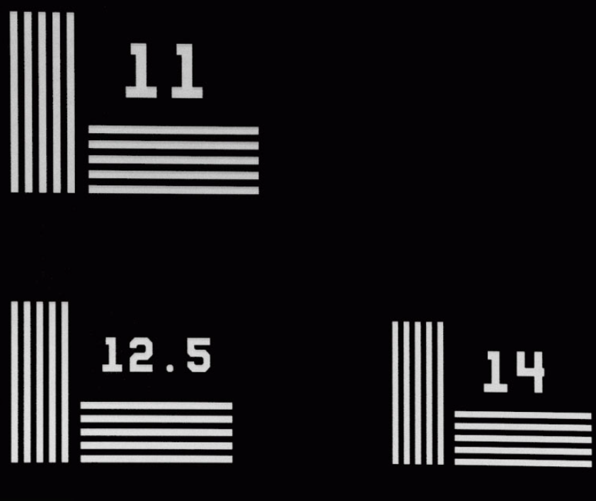LBTEK提供50.8×50.8 mm的正负NBS 1963A分辨率测试靶,两款分辨率测试靶均包含五条水平线和五条垂直线,共26组,分别对应1 mm-55.6 µm线宽。分辨率测试靶包含正(明场)、负(暗场)分辨率测试靶。正分辨率测试靶是在钠钙玻璃基底上镀铬,使非图案部分透光。负分辨率测试靶则是在基底上镀铬,使图案部分透光。如有其它定制需求,请联系技术支持。